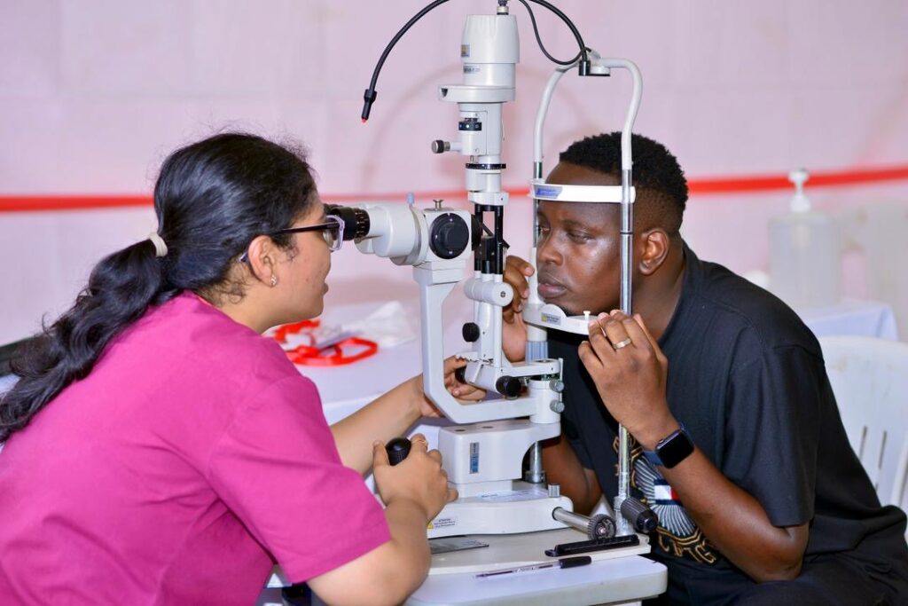 Doctor attending to patients during the Rajiv Ruparelia Memorial Eye Camp at Bukedea Teaching Hospital, where thousands are receiving free eye care.